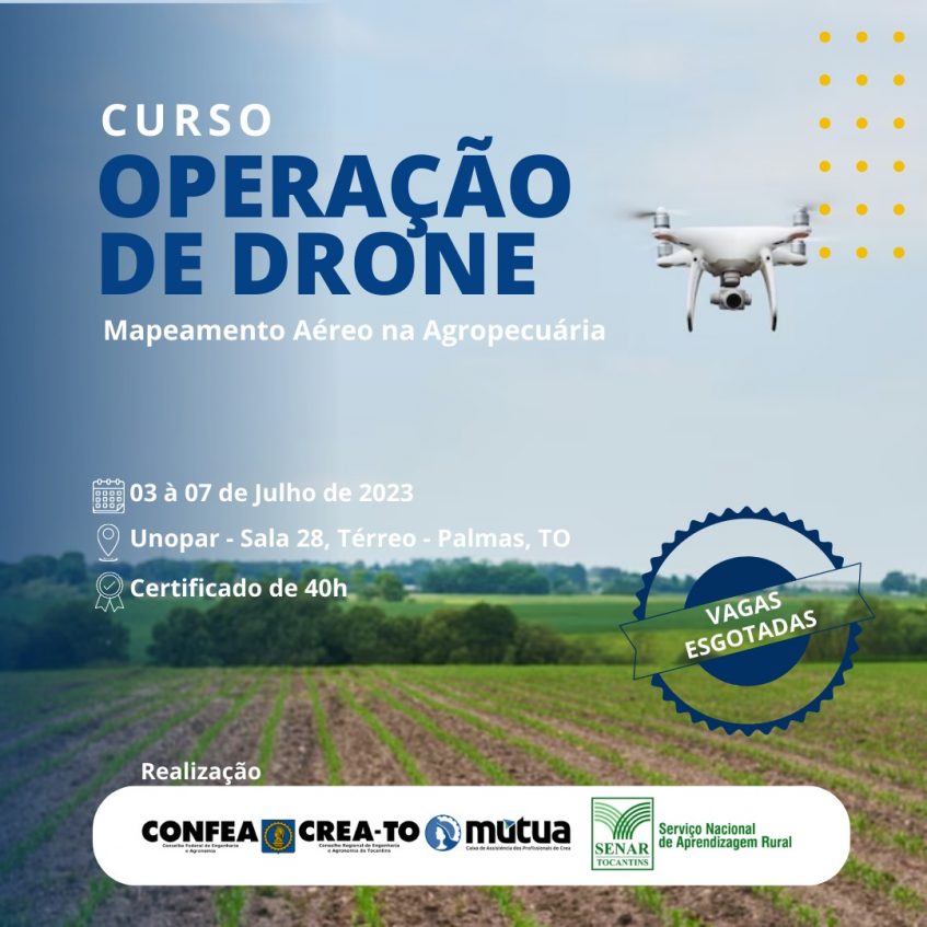 O Conselho Regional de Engenharia e Agronomia do Tocantins (Crea-TO) realiza dos dias 03 a 07 de julho em parceria com o Senar Tocantins o curso de “Operação de Drone: Mapeamento aéreo na agropecuária”, em Palmas. O curso com certificado emitido pelo Senar terá duração de 40 horas.